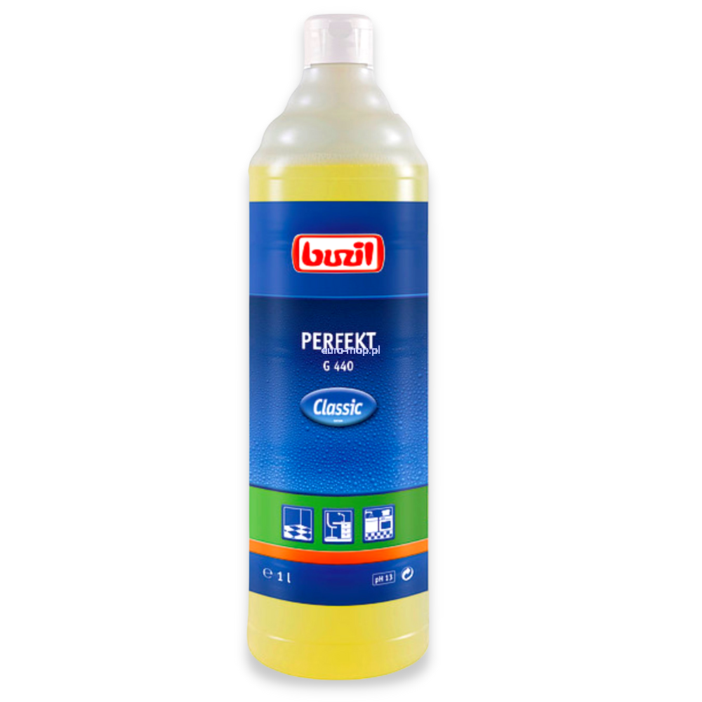 Buzil Perfekt G 440 to zasadowy środek do czyszczenia bieżącego, intensywnego i gruntownego materiałów, nawierzchni i posadzek podłogowych odpornych na działania zasad. Odtłuszczacz Buzil Perfekt G440 jest stosowany w warsztatach samochodowych i mechanicznych, zakładach przemysłowych, produkcyjnych fabrykach, oraz w przemyśle spożywczym. Buzil Perfekt G440 usuwa także stare zabrudzenia olejowo-tłuszczowe, doskonale sprawdza się w doczyszczaniu pomieszczeń po pożarach. Możliwość stosowania w myciu wysokociśnieniowym i w automatach myjących. Ujęty na liście RK. pH: 13-14. Dozowanie w karcie technicznej produktu